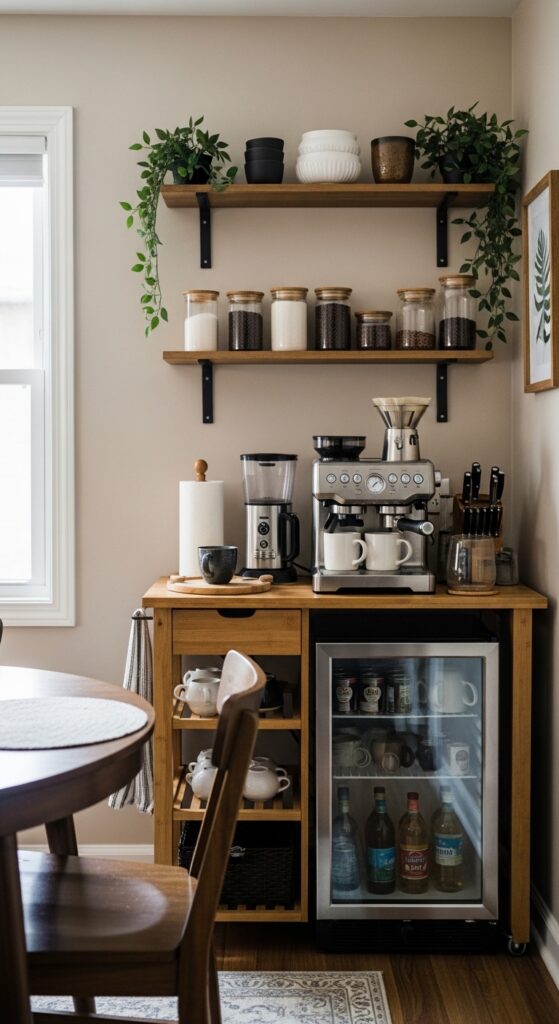 This setup keeps everything contained in one spot, freeing up precious kitchen counter space while creating an intentional, functional corner.