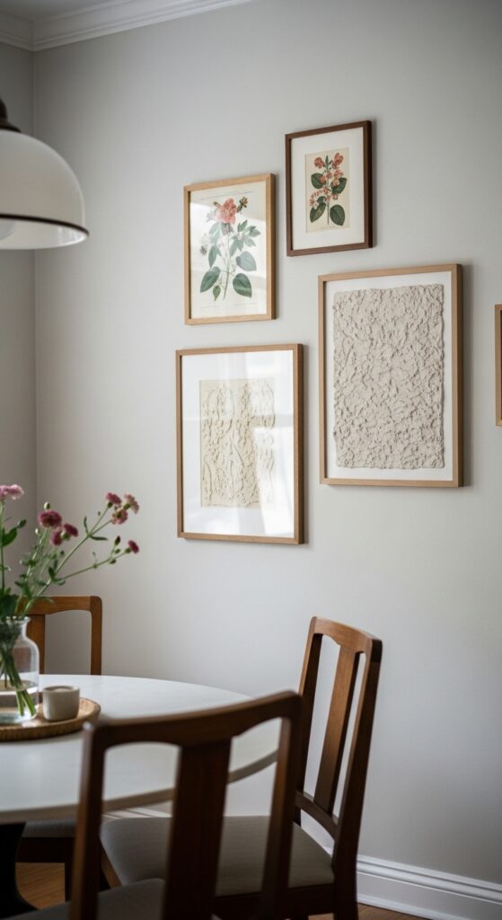Art collections don’t require expansive wall space to make a stunning visual impact in your small dining room corner. You’ll create depth and personality by clustering smaller pieces at varying heights. Mix framed photographs with canvas prints and textured artwork to establish visual interest.
