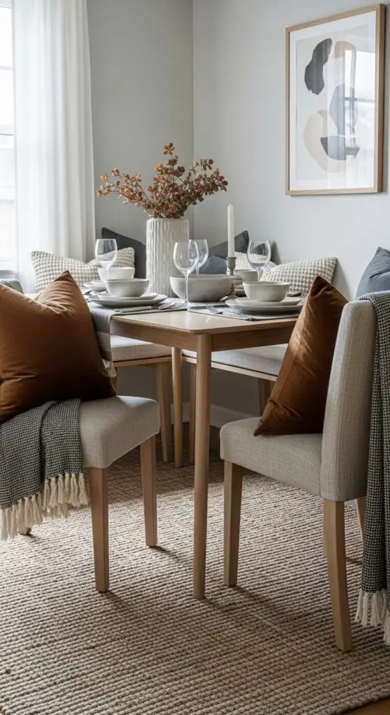 Layered textures through carefully chosen rugs and fabrics alter your small dining room from visually flat to richly inviting, creating depth that makes the space feel larger and more sophisticated. Start with a statement rug that anchors your dining table while defining the eating area’s boundaries.
