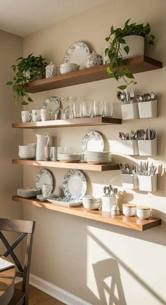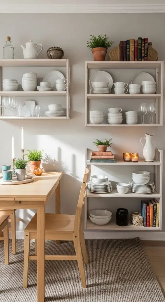 Since floor space comes at a premium in small dining rooms, you’ll want to think upward when adding both storage and visual appeal to your walls. Floating shelves create clean lines while displaying dishes, glassware, or decorative pieces that reflect your personal style. Install them at varying heights to create visual interest and accommodate different item sizes.