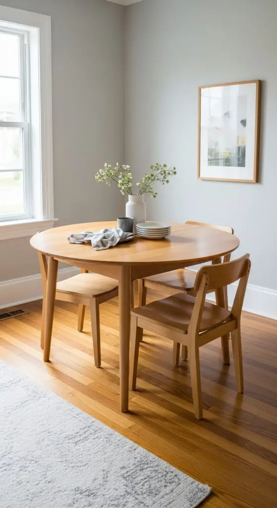 When considering round table scale, choose proportions that leave 36 inches of clearance on all sides for comfortable seating and movement. A 42-inch round table typically accommodates four people while maintaining excellent flow. Compact dining tables are specifically designed to maximize functionality while fitting comfortably in limited spaces. Complete your cozy table vignette with compact chairs that tuck completely underneath when not in use.