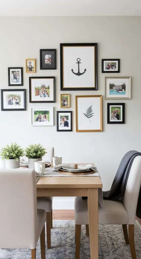 Mix personal photos with artwork to add visual depth and prevent overwhelming sentimentality. Choose frames in coordinating colors—black, white, or warm metallics work beautifully together. Arrange photos in asymmetric layout rather than perfect grids; this creates variable energy that draws eyes around the room. Start with your largest piece as an anchor, then build outward organically.