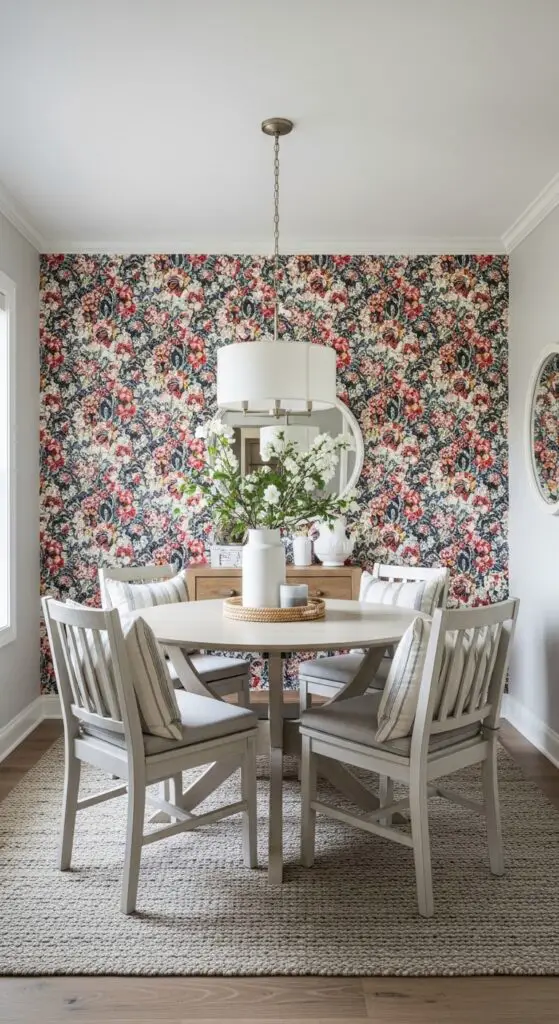 Bold wallpaper alters your small dining room into a dramatic focal point that visually expands boundaries while establishing clear definition between spaces. You’ll create instant personality by choosing bold floral patterns that draw the eye upward, making ceilings appear taller than they actually are.