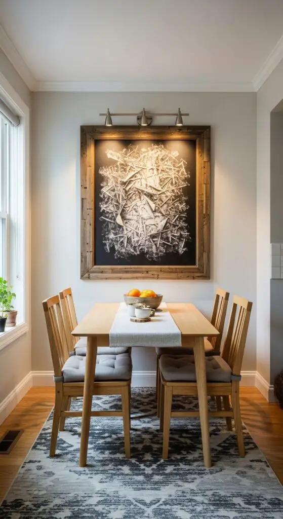 One carefully chosen piece of artwork alters your small dining room’s walls from empty space into an engaging visual anchor that draws guests’ attention upward. Select oversized pieces that command presence without overwhelming your intimate space.
