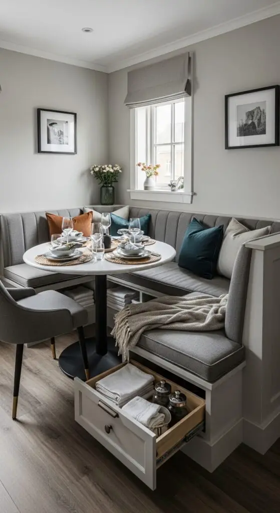 Built-in banquettes eliminate the need for individual chairs while accommodating more people around your table. You’ll maximize storage capacity by incorporating drawers or lift-up compartments beneath the cushioned seats for linens, seasonal items, or dining essentials.