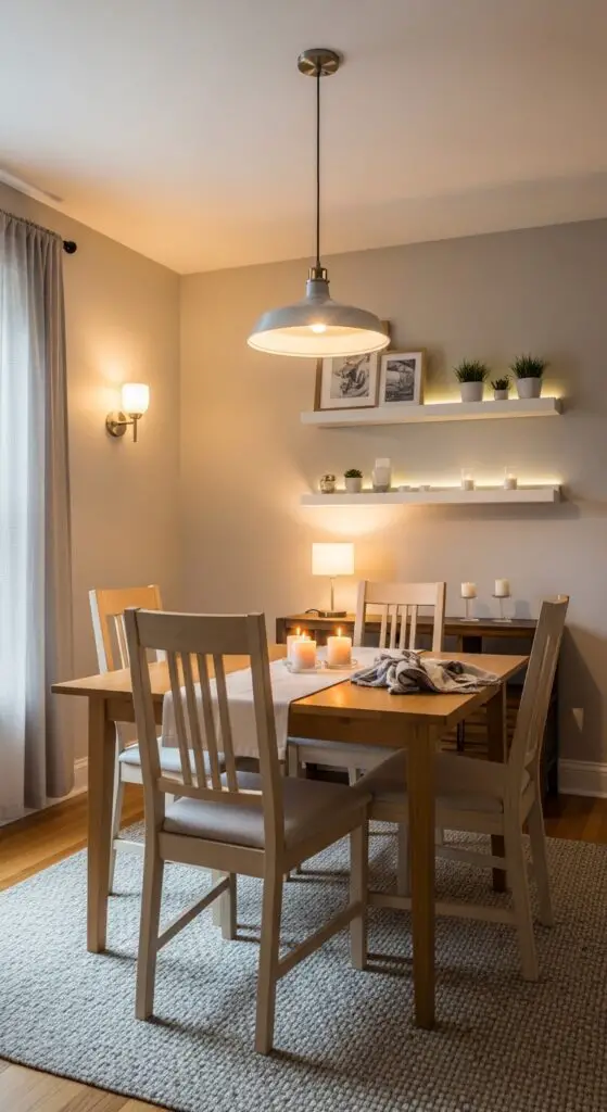 Incorporate dimmers on your main ceiling light to adjust brightness throughout the day. Add candles or battery-operated LED strips under floating shelves for subtle ambient glow. String lights around windows or artwork provide soft accent lighting that doesn’t consume precious floor space, giving you complete control over your dining atmosphere. Choose compact fixtures that maximize style without overwhelming your space’s proportions.