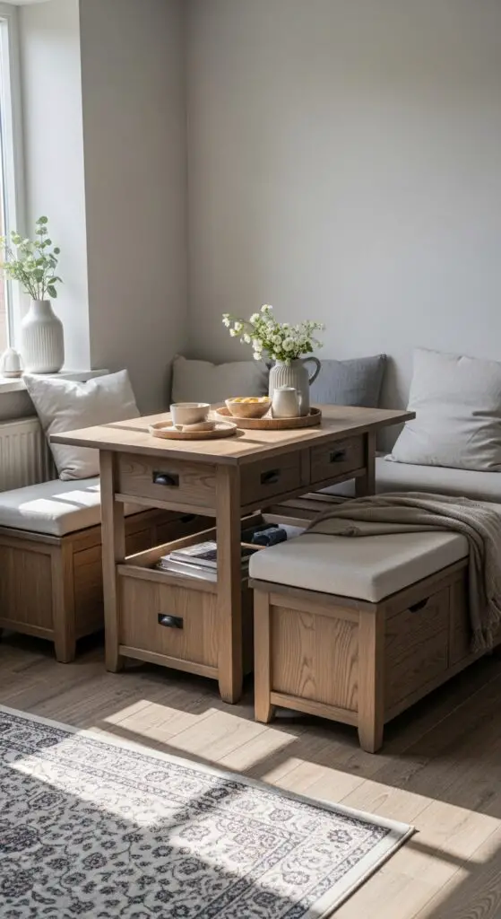 Consider benches with hidden compartments instead of traditional chairs – they’ll provide dual purpose storage solutions while maintaining clean lines. Ottoman-style seating doubles as extra surface space when needed. These smart choices help you break free from cramped quarters while maintaining the cozy atmosphere you’re after.