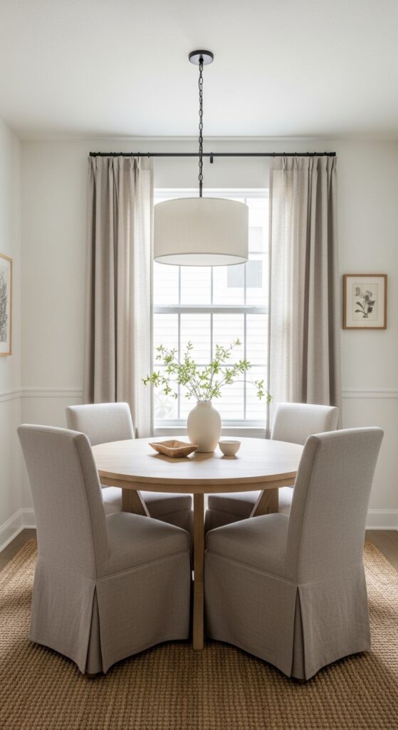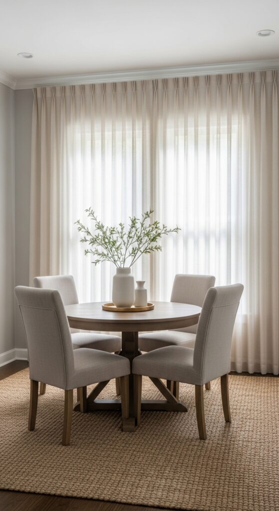 Floor-to-ceiling curtains create an instant illusion of height that modifies your small dining room into a more spacious and refined environment. You’ll draw the eye upward, making low ceilings appear taller while adding sophisticated style to your space.