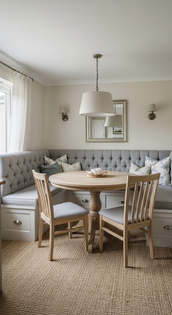Built-in benches optimize layout functionality by eliminating the need for chair backs to clear walkways. Add cushions and pillows for comfort and style. Consider incorporating storage underneath the seating for linens, seasonal items, or dining accessories. Corner space becomes particularly valuable when designing banquette layouts that wrap around dining areas. This approach converts awkward wall space into functional, attractive seating that guests will love.