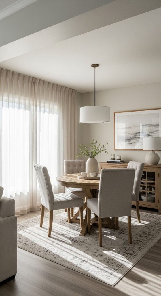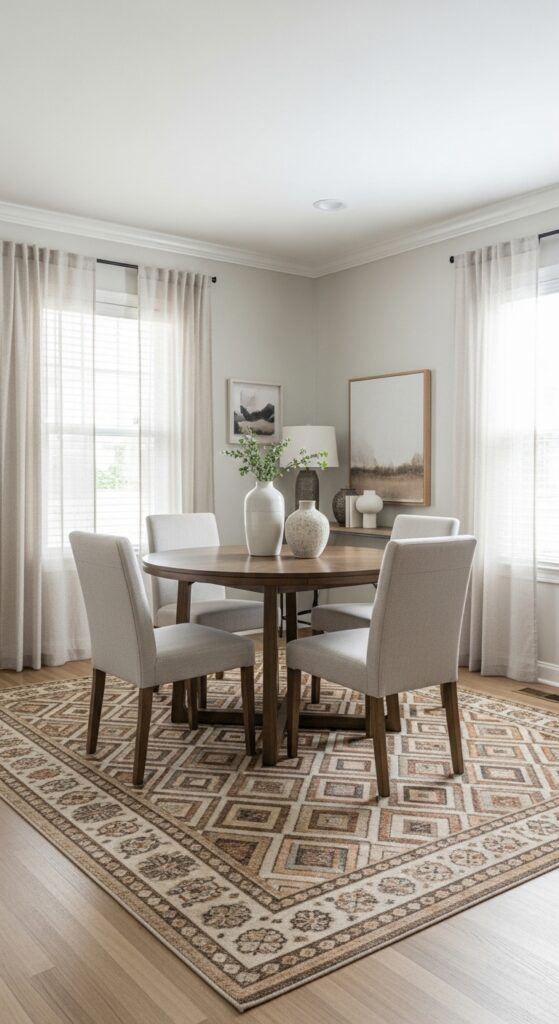 You’ll want to anchor the rug with furniture by positioning your dining table and chairs completely on top of it. This technique unifies your seating area and makes the room appear larger than its actual dimensions.