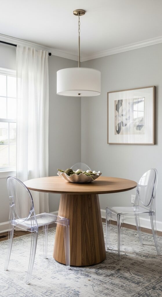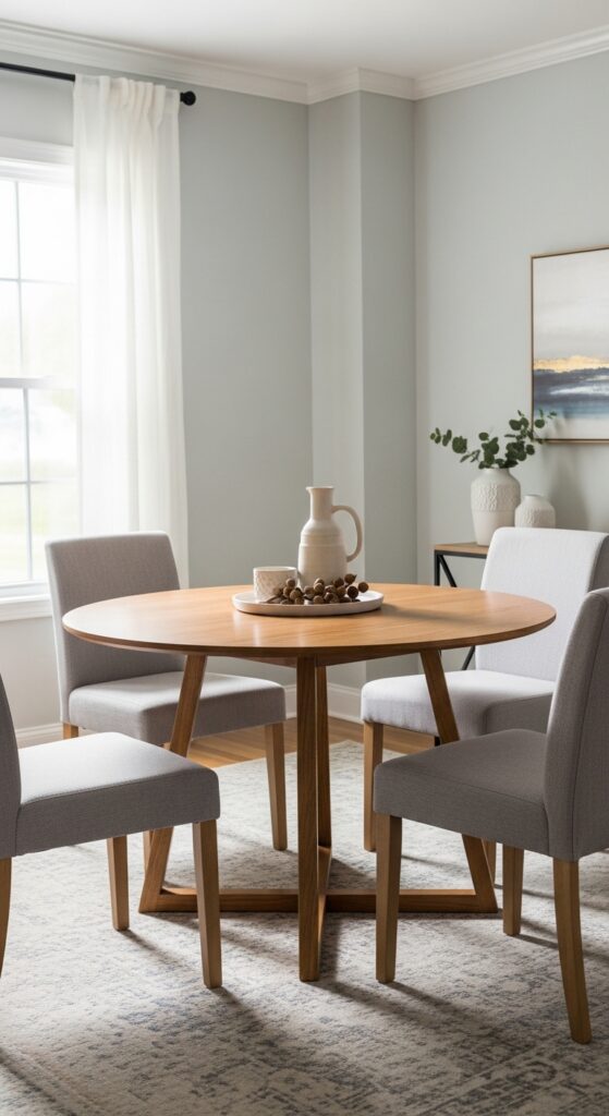 Round tables eliminate awkward corner positioning against walls, giving you flexible placement options that maximize your room’s breathing space. Consider pedestal styles that further enhance the open feel by eliminating bulky table legs at the corners.