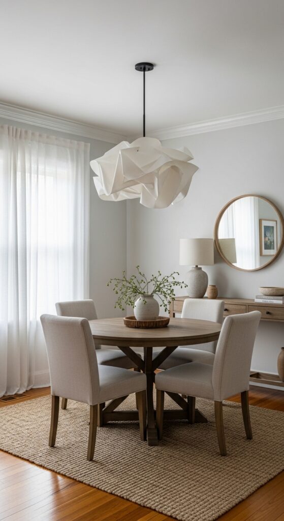 You’ll maximize this effect by choosing semi-gloss or satin finishes that reflect more light than flat paints. Use natural textiles like linen curtains or jute rugs to add warmth without overwhelming the space. White dining room designs create a particularly fresh and clean aesthetic that enhances the sense of openness. Complement with subtle accents through artwork or small decorative pieces that won’t compete with your carefully chosen palette.