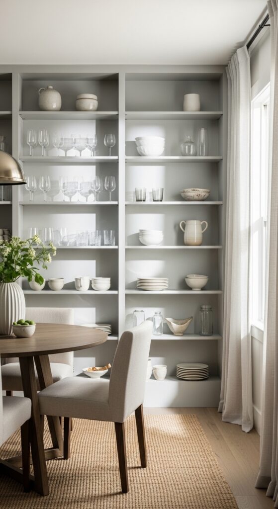 Keep surfaces clear by storing serving dishes in closed cabinets instead of displaying them openly. Select minimal accent pieces that serve dual purposes, such as a bench with hidden storage or floating shelves. This approach creates decluttered visual appeal while maintaining functionality.
