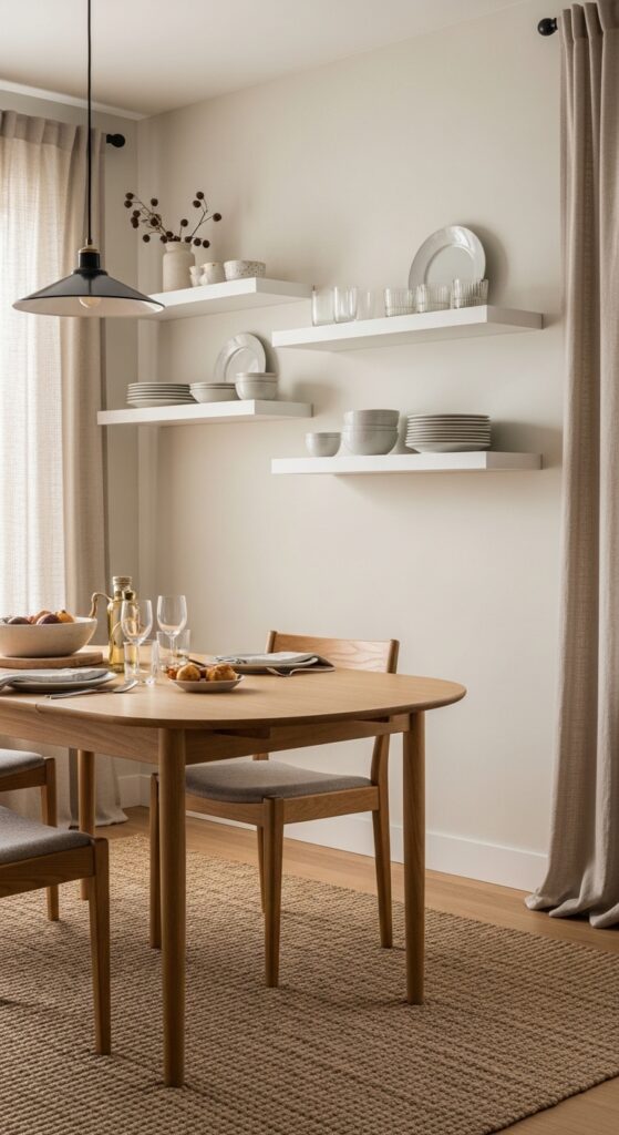 Traditional storage units steal precious floor space that small dining rooms can’t afford to lose. You’ll create an airy atmosphere by installing floating shelves that draw the eye upward and maximize vertical storage without overwhelming your space.