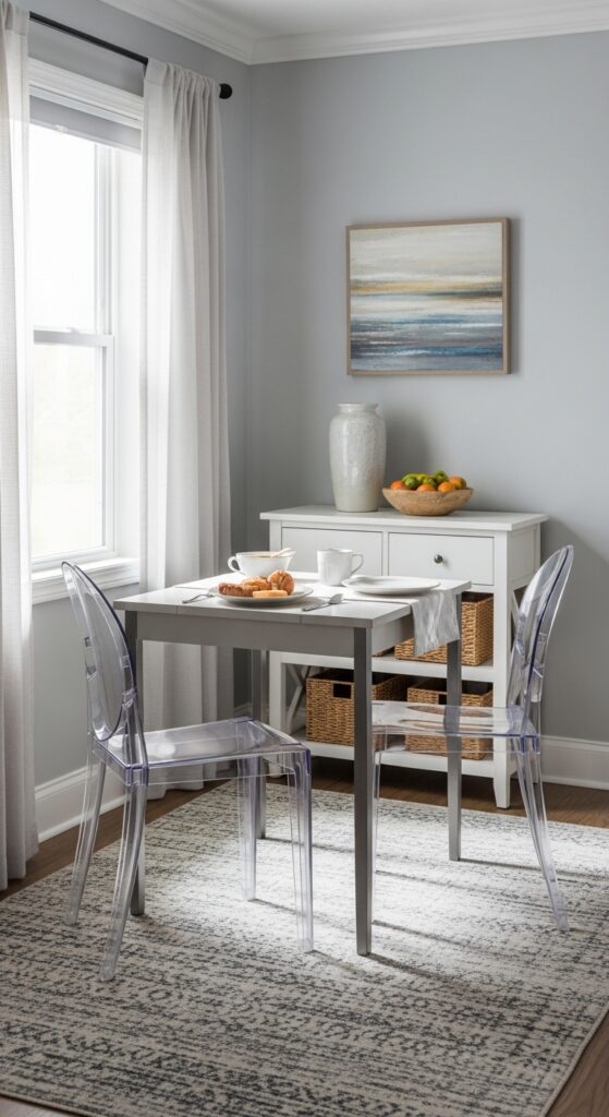 Beyond creating visual flow between rooms, minimalist design principles can alter your small dining room into a spacious, serene environment. Choose one statement piece—like a sleek dining table or single artwork—rather than multiple competing elements.