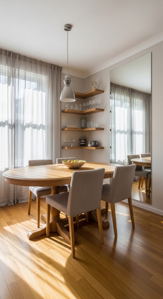 Mirrors act as optical illusions that can instantly metamorphose your cramped dining room into what appears to be a much larger, brighter space. You’ll want to angle mirrors strategically across from windows to capture and bounce natural light throughout the room.