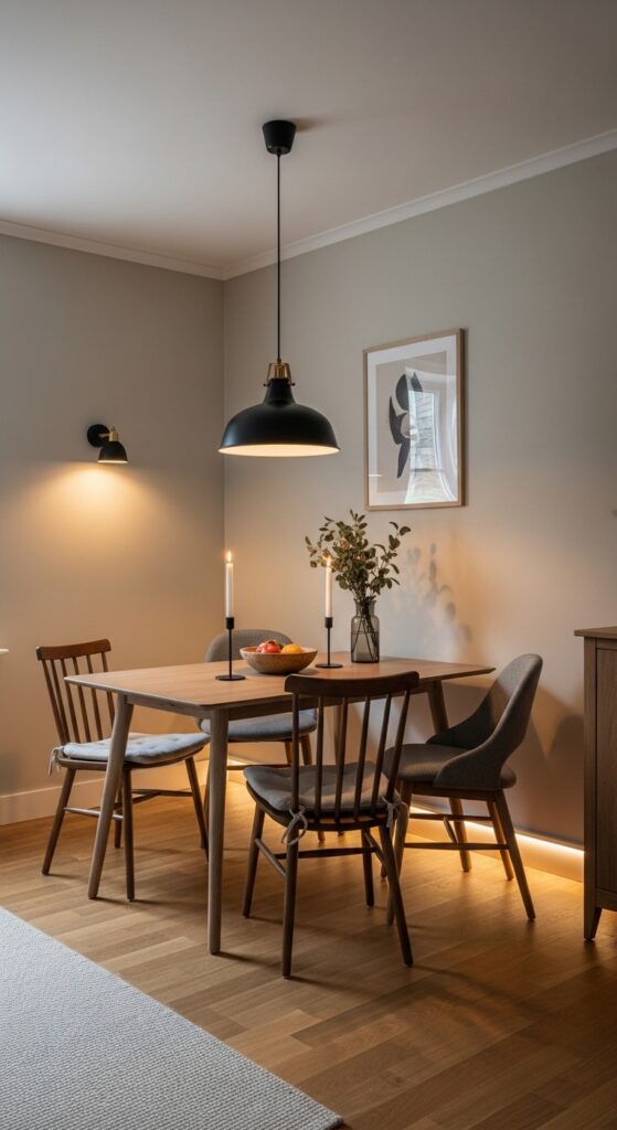 Create focused lighting layers by combining general ambient fixtures with strategic task lighting placement over your dining table. Position recessed lights 12-18 inches from walls to wash vertical surfaces with light, making boundaries appear to recede. This technique instantly expands your space’s visual footprint while maintaining the intimate atmosphere you need for memorable meals.