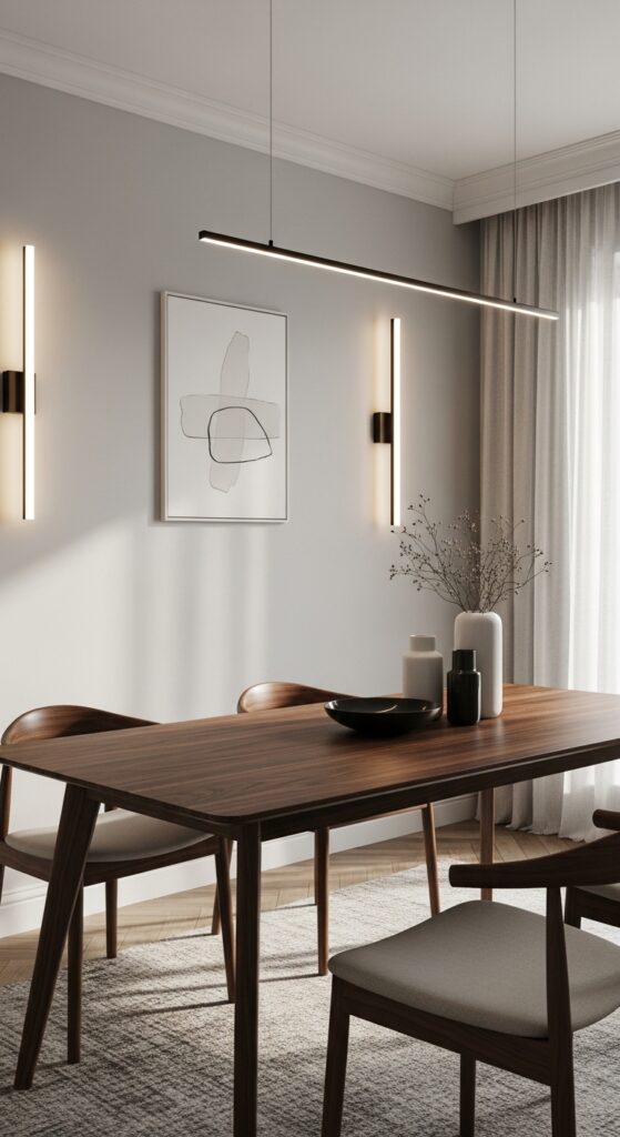 Linear LED strip lights create clean, uninterrupted illumination that perfectly complements the sleek aesthetics of modern minimalist dining rooms. You’ll achieve sophisticated ambiance without cluttering your space with bulky fixtures that compromise your design vision.