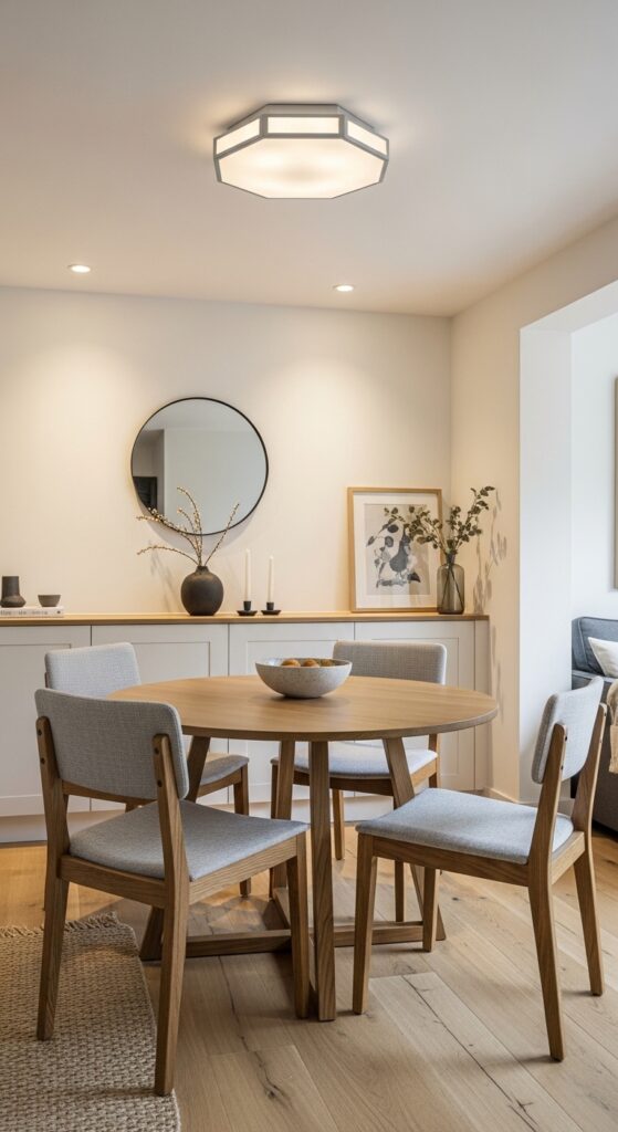 Consider discreet downlights for focused task lighting over your dining table, or choose statement flush mounts with interesting textures or patterns. Many fixtures offer dimming capabilities, letting you adjust brightness for intimate dinners or bright family meals while maintaining your room’s open, uncluttered feel. Light-colored fixtures can reflect more light throughout your space, enhancing the illusion of a larger dining area.