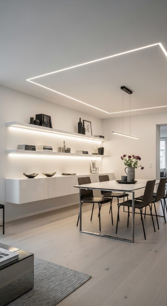 Install linear led strip accent lighting under floating shelves or along ceiling perimeters to establish dramatic architectural emphasis. Mount strips directly above your minimalist dining table lighting zone to provide focused task illumination while maintaining the room’s streamlined appearance.