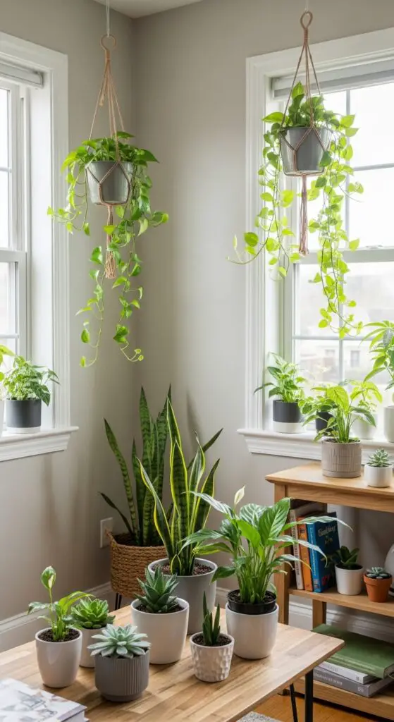 Incorporate small tabletop plants like succulents, snake plants, or peace lilies on windowsills, coffee tables, and shelves. Mix different heights and textures to create visual interest. Complement your greenery with soft tones and natural wood elements to achieve that perfect spring balance in your apartment. Start with low-maintenance varieties if you’re new to plant care—you’ll build confidence while altering your space into a dynamic spring sanctuary.