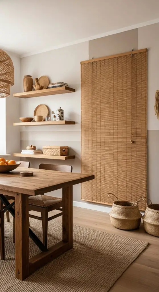Bamboo blinds, jute rugs, and woven baskets introduce additional organic textures that complement wooden elements beautifully. Your sustainable material choices create healthier indoor air quality while reducing environmental impact.