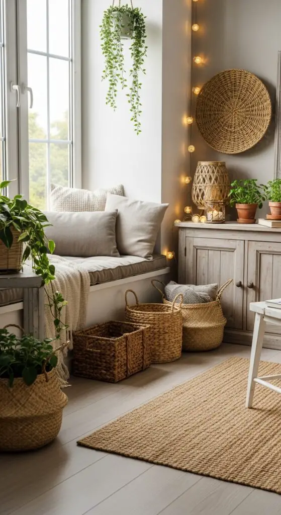 Add natural textures like woven baskets, jute rugs, and linen throws to create warmth. I recommend incorporating potted herbs or trailing plants to bring life into your cozy reading nook. Layer in soft lighting with string lights or a vintage lantern.