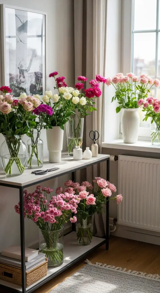 Choose a small console table, floating shelf, or kitchen counter corner as your designated spot. Focus on seasonal flower selection to maximize freshness and affordability—tulips and daffodils for early spring, peonies for late spring. Keep multiple vases in varying heights nearby, plus sharp floral scissors and flower food packets for easy maintenance.