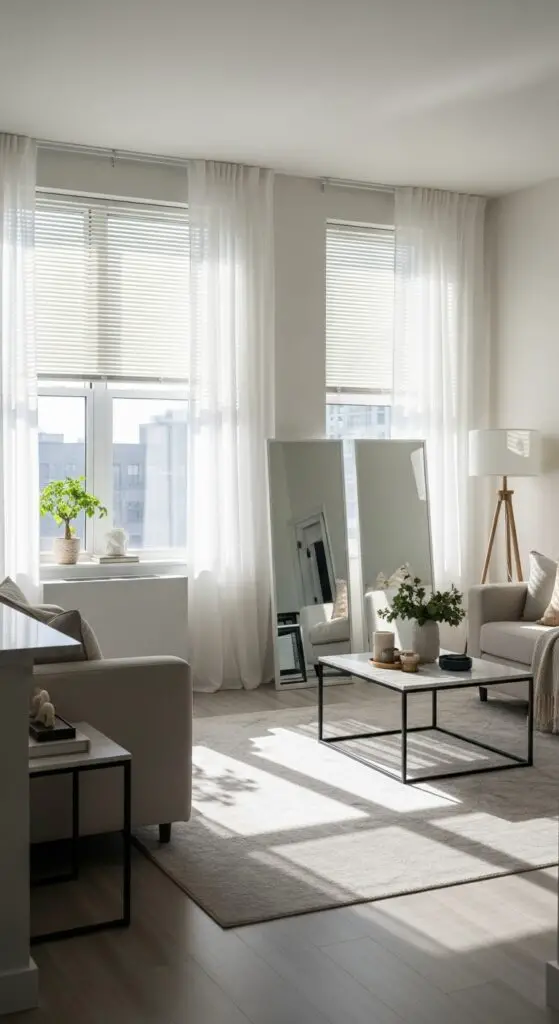 Consider mirrored furniture pieces like side tables or wardrobes that serve dual purposes—they’re functional storage while amplifying light reflection throughout your apartment.