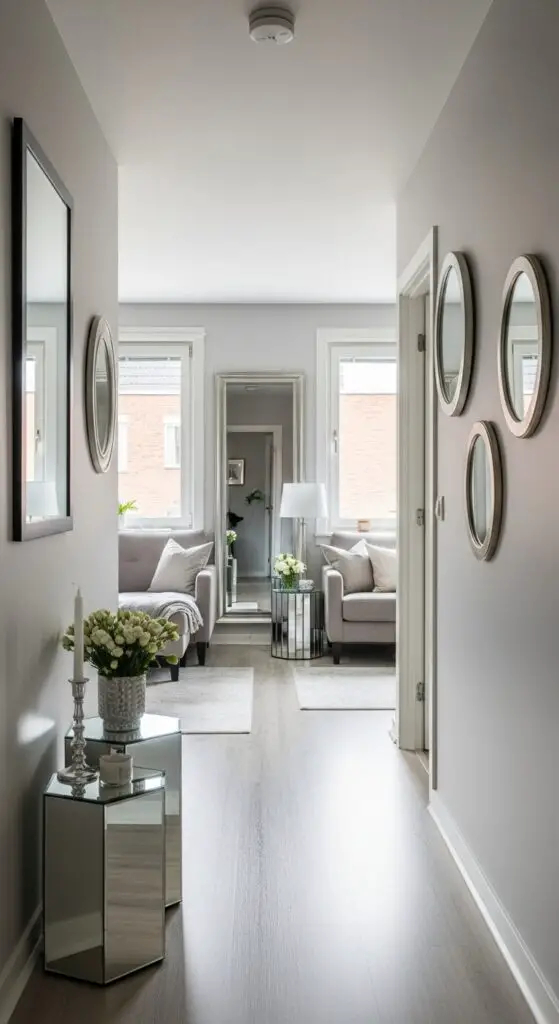 Create visual interest by grouping smaller mirrors at varying heights along hallways or behind furniture. This technique adds depth while making narrow spaces feel more expansive.