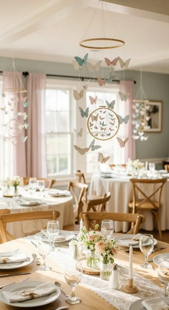 Choose lightweight paper or fabric butterflies with fluttering textures that catch air currents naturally. Suspend them using clear fishing line attached to mobile suspension mechanisms like embroidery hoops or wooden dowel crosses. Position these at varying heights above each table to create depth.