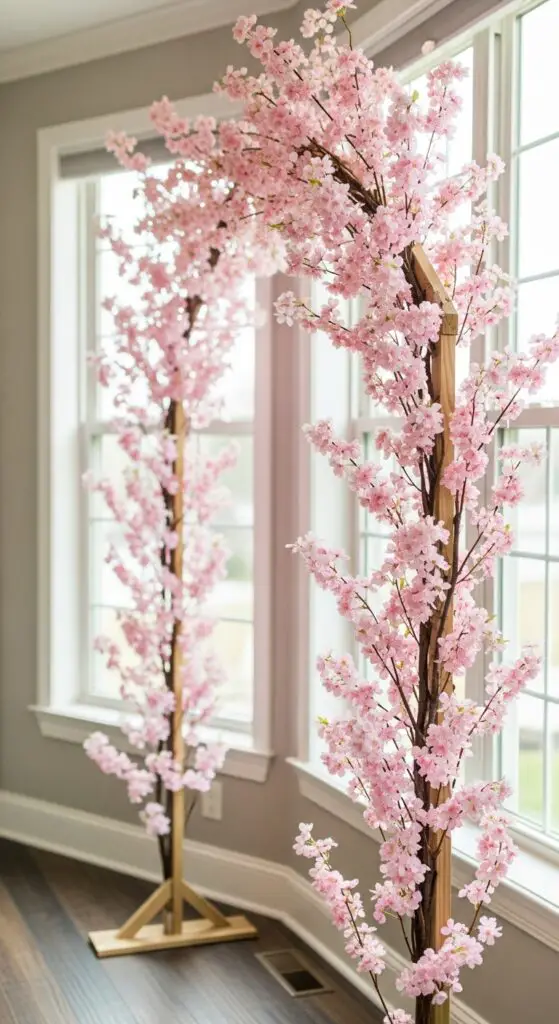 You can craft bespoke blossom installations by securing artificial cherry blossom branches to lightweight wooden or metal frames. Position these arches strategically around your venue’s entrance or gift table area. The flowing branches frame guests beautifully while adding romantic spring atmosphere to every captured memory.