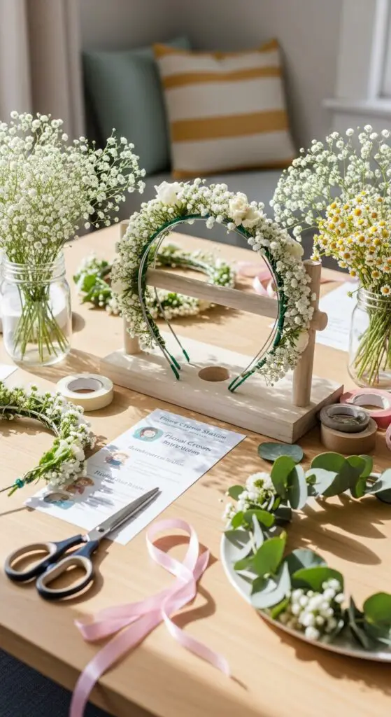 Interactive DIY floral crowns let guests express creativity while socializing naturally. Position the station near good lighting for photos, and include instruction cards with simple crown-making steps. This hands-on activity keeps guests engaged throughout the celebration while creating beautiful, personalized mementos they’ll treasure.