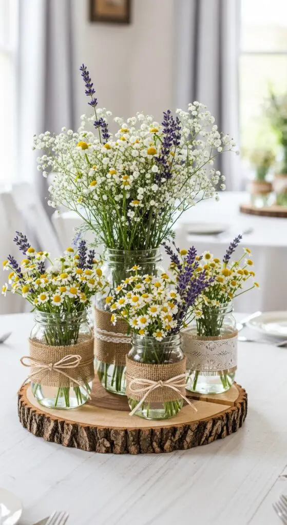You’ll want to vary jar heights across your tables for visual interest. Wrap twine around each jar’s rim, then add burlap ribbon for extra texture. These natural elements work beautifully with other spring decor while staying budget-friendly.