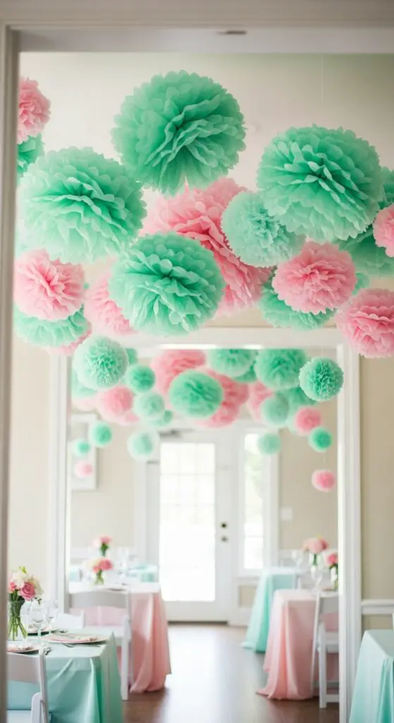 Create stunning tissue paper pom pom backdrops by clustering different sizes along walls or doorways. Mix varying shades of mint and blush pink for depth and visual interest. Hang airy pom pom clusters at different heights using fishing line for a floating effect.
