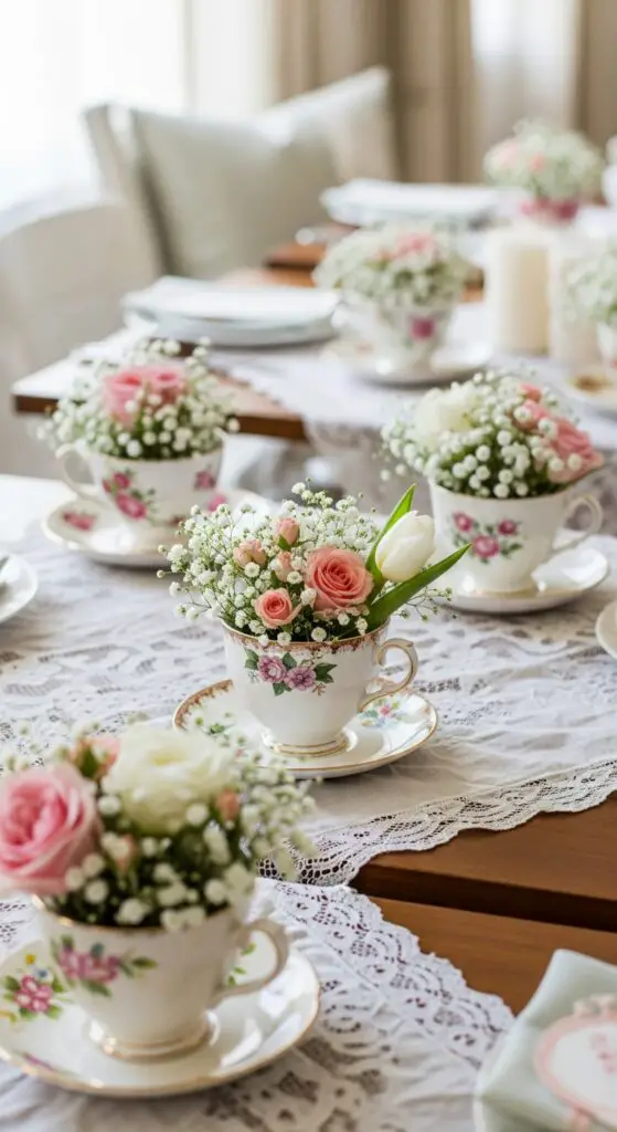 Start by collecting mismatched teacups from thrift stores or your grandmother’s china cabinet. Fill each cup with small spring flowers like baby’s breath, mini roses, or delicate tulips. Place these arrangements on antique lace table linens to enhance the nostalgic aesthetic.