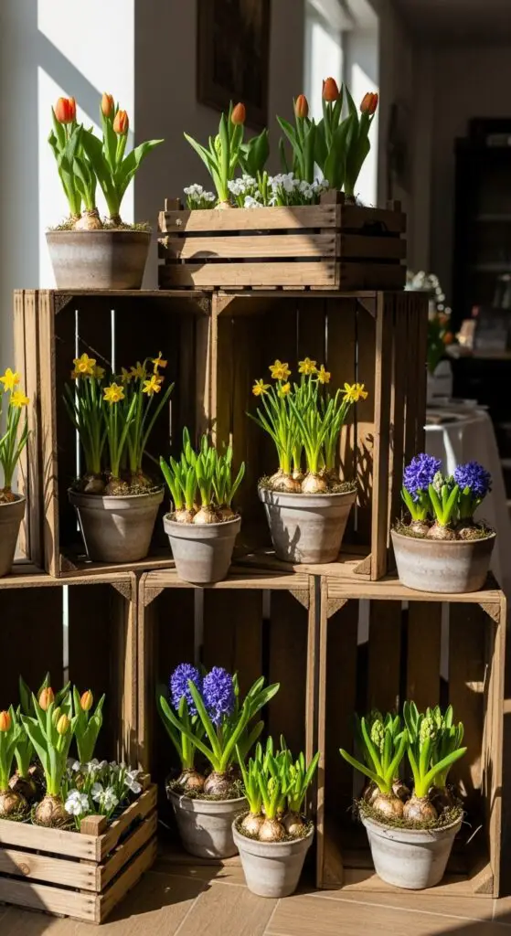 Wooden Garden Crate Displays With Potted Spring Blooms