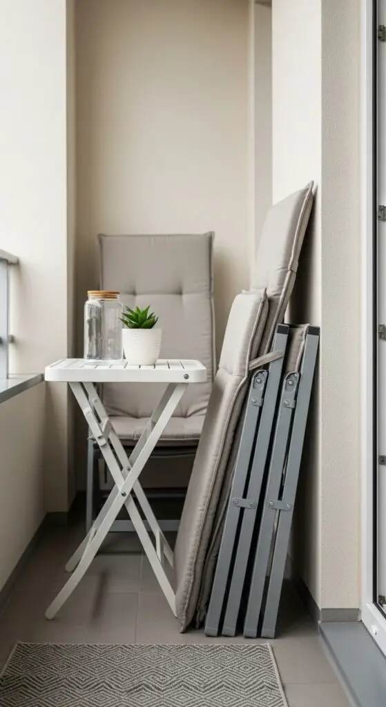 Foldable furniture converts even the tiniest balcony into an entertainment-ready space that adapts to your hosting needs throughout spring and beyond. I recommend investing in lightweight foldable side tables that easily store against walls when you’re not entertaining guests. These versatile pieces provide surface space for drinks, snacks, or decorative elements during gatherings.