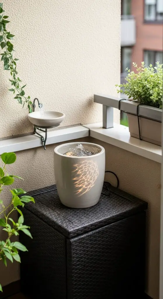 You can add a small water fountain to corner tables or plant stands, creating gentle sounds without overwhelming your compact area. For wildlife enthusiasts, incorporate a bird bath on sturdy railings or wall-mounted brackets. These compact water features attract colorful songbirds while adding natural movement to your space. Solar-powered options eliminate electrical concerns, giving you complete installation freedom.