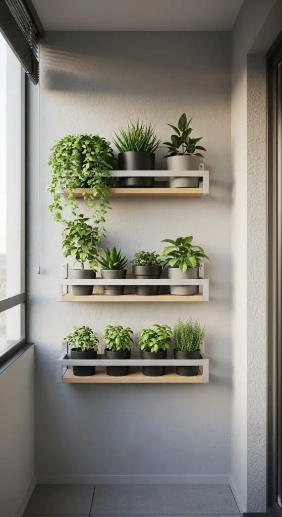 When vertical space becomes your greatest asset, wall-mounted shelves convert blank balcony walls into stunning plant galleries that maximize your growing potential. I recommend installing decorative wall brackets at varying heights to create visual interest and accommodate different plant sizes.