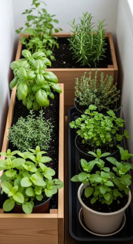 Raised planter beds maximize your growing space while creating an organized herb station. Choose a compact rectangular planter that fits your balcony’s width, then plant complementary herbs together. Position sun-loving herbs like rosemary and thyme toward the back, with shade-tolerant cilantro in front.