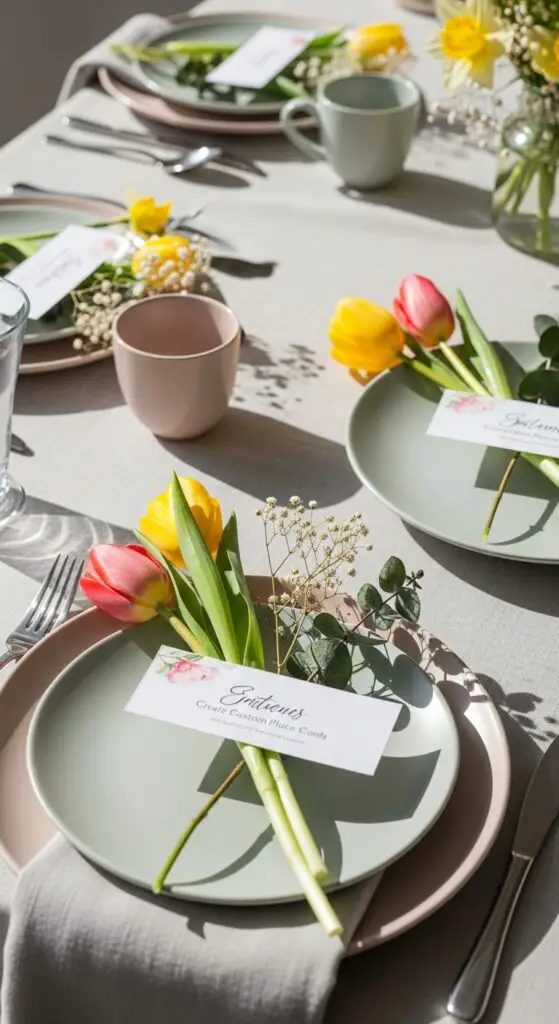 Since fresh flowers already grace your spring brunch table, converting them into personalized place cards creates a refined dual-purpose element that guests will absolutely adore. I recommend selecting sturdy stems like tulips or daffodils that won’t wilt quickly during your gathering.