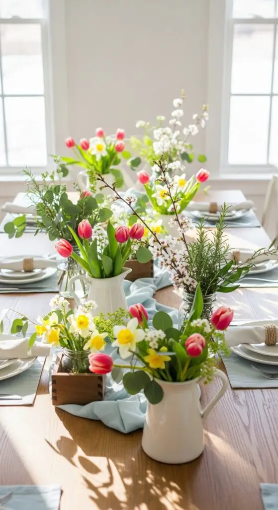 When spring arrives with its lively colors and fresh energy, seasonal centerpieces become the heart of your brunch table design. I recommend you arrange flowers in unique vases like vintage mason jars, ceramic pitchers, or wooden boxes for unexpected charm.