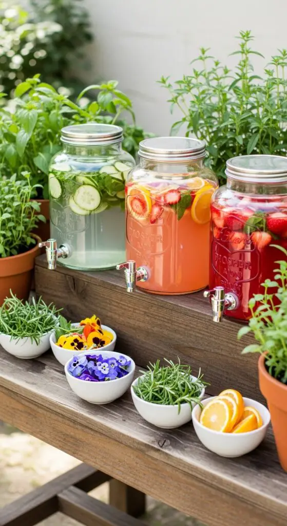 Start with seasonal fruit infusions like cucumber-mint water or strawberry-basil lemonade in glass dispensers. Add herbal tea garnishes such as fresh rosemary sprigs, edible flowers, or citrus wheels arranged in small bowls. Position everything on a rustic wooden table surrounded by potted herbs, allowing guests to customize their beverages while embracing spring’s fresh, lively flavors.