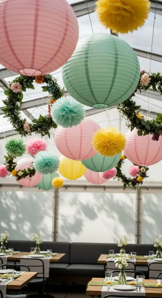 I recommend selecting paper lanterns in soft pastels like blush pink, sage green, or buttery yellow to complement your table setting below. You can also hang floral wreaths at varying heights to create lively visual layers throughout your space.