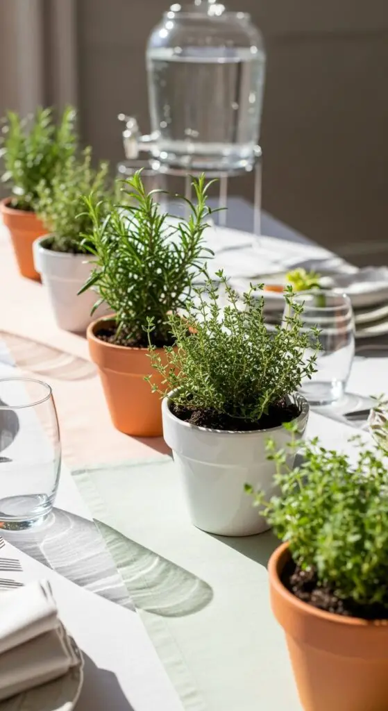 Include pots of rosemary near savory dishes since guests can snip sprigs for roasted potatoes or egg dishes. Feature fragrant thyme plants alongside your beverage station, allowing visitors to add fresh leaves to cocktails or garnish breakfast items. Choose matching terracotta or white ceramic containers to maintain visual consistency. Complement your herb arrangements with soft tones throughout your table setting to create a harmonious natural spring aesthetic. This approach gives your guests freedom to customize their plates while adding natural beauty.