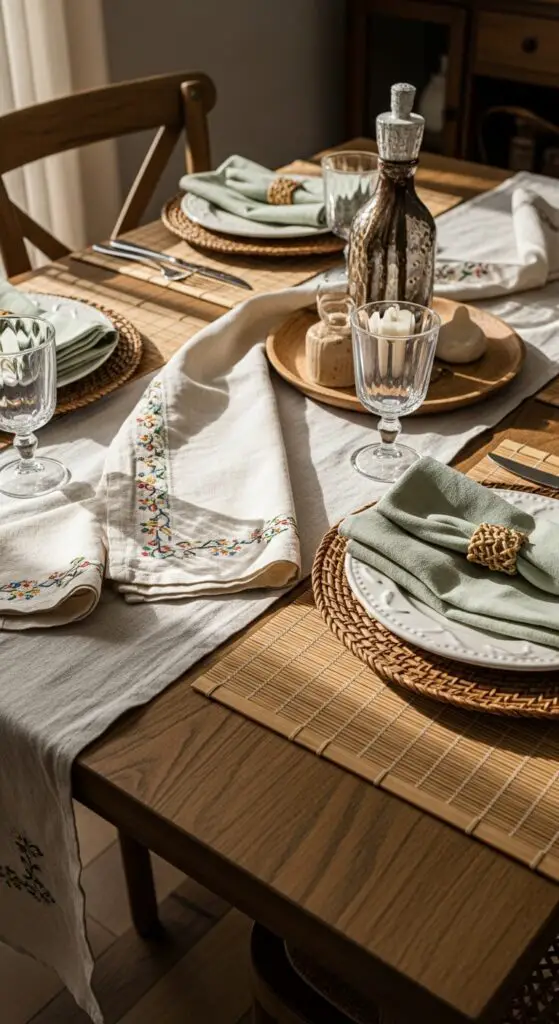 Layer crisp linen napkins in cream or soft sage over these textured bases for sophisticated contrast. You can incorporate linen table runners down the center, creating visual flow while protecting your table surface.