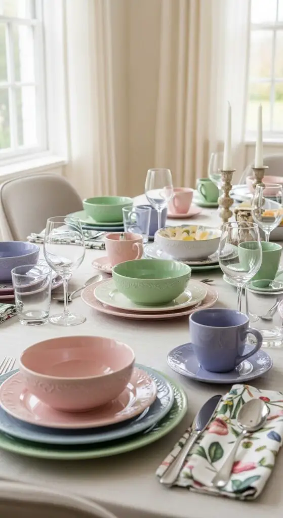 Layer different pastel plates, bowls, and cups to build dimension on your table. Add simple floral accents through cloth napkins with botanical prints or delicate flower patterns on serving pieces. This approach gives you freedom to use existing dishes while creating a cohesive spring aesthetic.