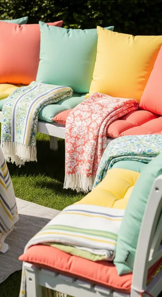 Alter your patio or garden into a cozy outdoor lounge by layering weatherproof cushions in coral, mint green, and sunny yellow across benches and chairs. Add lightweight throws in complementary patterns—think florals mixed with stripes—to create visual depth.