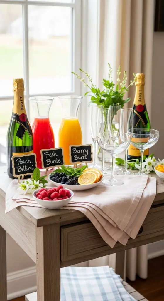 Your quality glassware selection should include tall flute glasses or refined coupe glasses that enhance the drinking experience. Create small chalkboard signs displaying unique mimosa recipe ideas such as “Peach Bellini” or “Berry Burst” combinations. Position garnishes like fresh berries, orange slices, and mint sprigs in small bowls nearby.